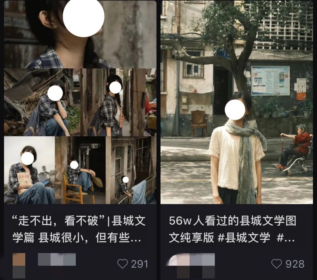 现在,大家愿意借由县城文学,千禧年热曲等途径频繁地回到过去。“县城文学”流行于小红书的一种拍照模板,模特穿着酷似千禧年左右国产悬疑剧中的装扮,配上迷茫,惆怅的眼神,此时配乐悠悠响起:走不出,看不破。