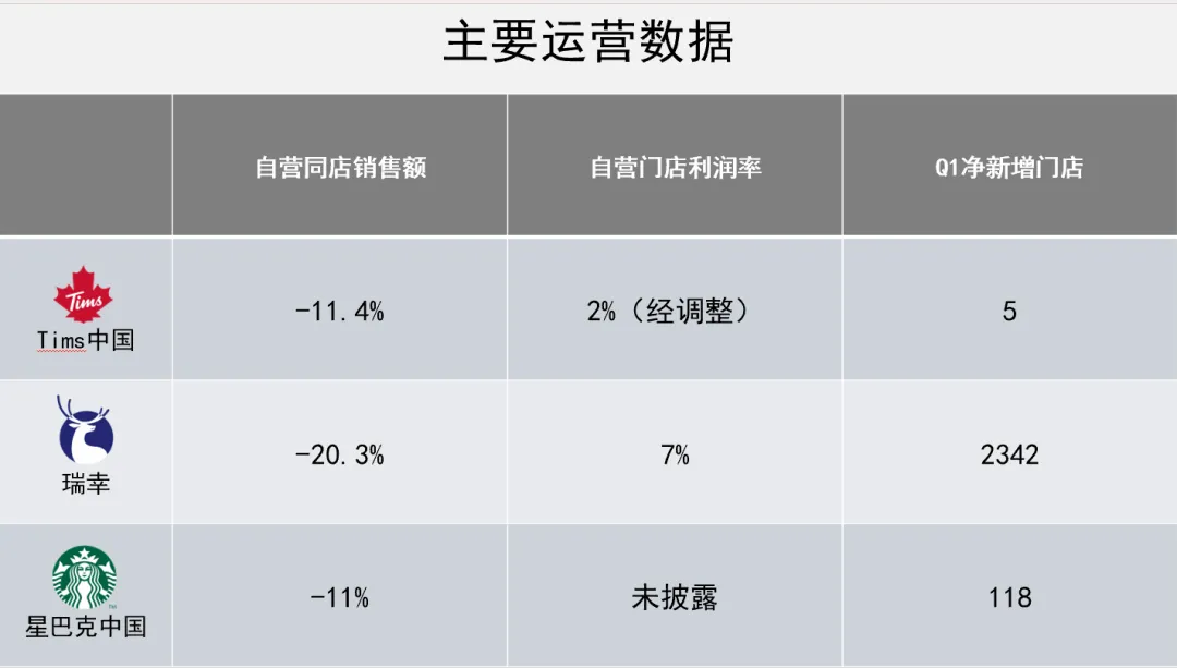 2024年第一季度,Tims系统同店销售额下降13.6%,其中自营门店同店销售额下降11.7%联营门店的表现理论上更糟。而瑞幸同店销售额下降20.3%,星巴克同店销售额下降11%(其中客单价下滑8%,可比交易量下降4%)