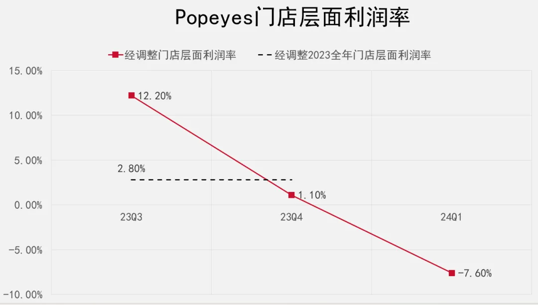 2024年一季度,Popeyes只开了1家门店,调整后门店利润率为-7.6%。门店扩张放缓,利润率进一步下降。