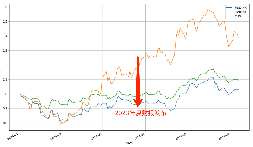 我们首先整理了2024年初至今美团,恒生指数以及恒生科技指数的走势情况。2024年Q1三条折线保持了高度的相关性,三月下旬之后美团股价抖升,与大盘逐渐拉开距离。