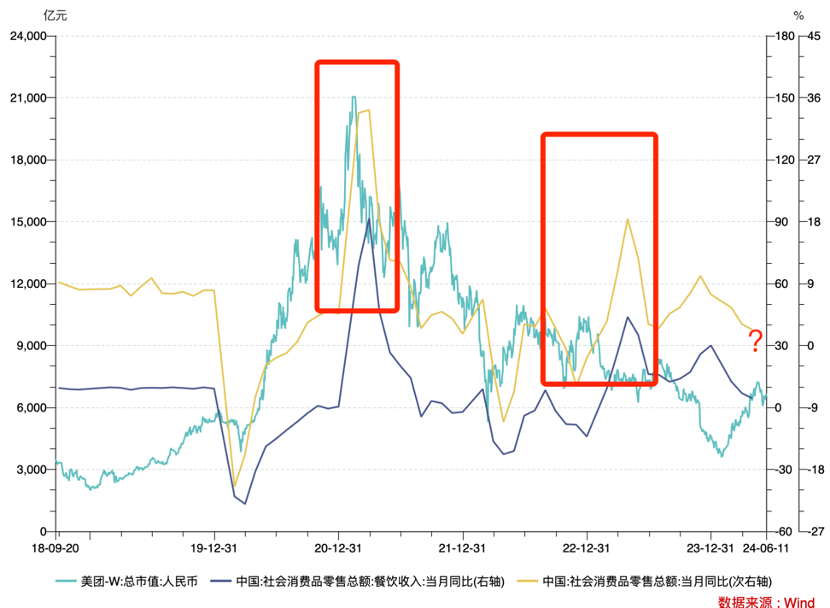 其二,美团市值的长期走势与社零和餐饮大盘息息相关,若8月前后行业走出超预期形态,则有利于下一阶段美团市值的表现,反之则是利空。