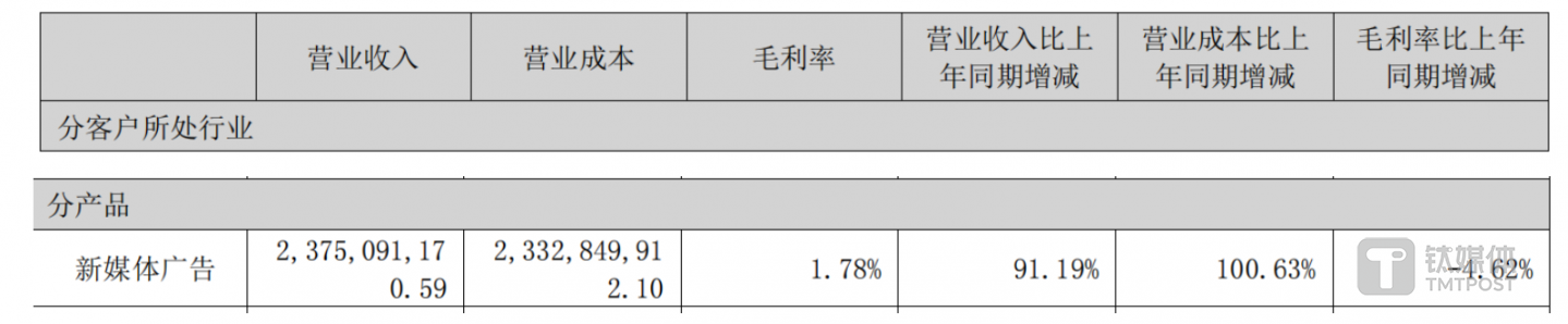 其实,随着直播带货业务日渐式微,公司收入增长主要依靠传统互联网广告业务。2022年,公司互联网广告投放业务和互联网广告代理业务营收分别为1.24亿元、11.18亿元,毛利率分别为27.99%、4.01%。