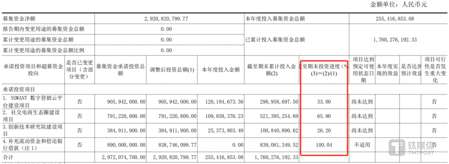 在募集资金到账后,8亿元补流资金很快使用完毕,但上述项目建设却非常缓慢。据了解,上述项目原定于2023年9月达到预定可使用状态,但到点之后进度却远不及预期,于是公司宣布延期一年,即到2024年9月达成。截至2023年底,上述项目进展依然较慢,“YOWANT数字营销云平台建设”的进度只有33%,“社交电商生态圈建设项目”进度只有65.9%,“创新技术研究院建设项目”进度只有26.2%。如此来看,上述项目能否在9月达成尚未可知。