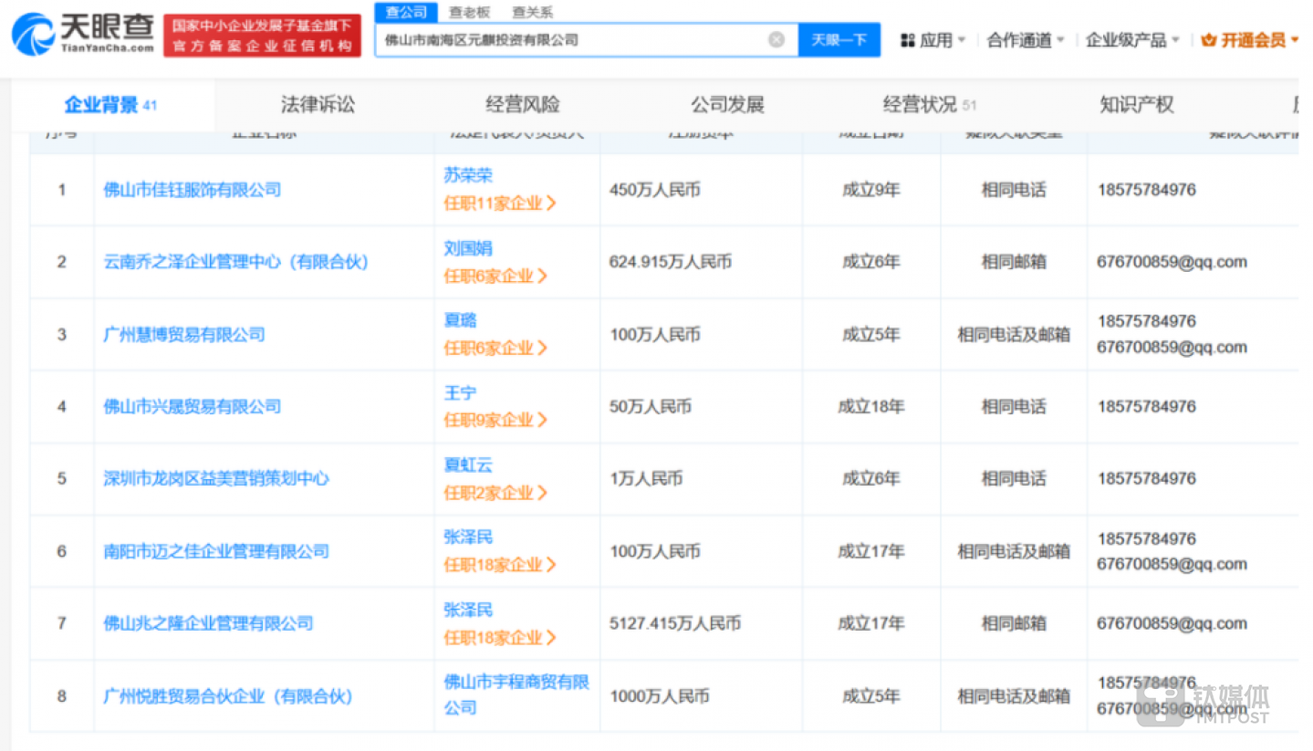 另外,杭州宏臻、杭州泓华和杭州欣逸有同一个股东—佛山市南海区元麒投资有限公司(下称“元麒投资”)。天眼查显示,元麒投资与多家公司有相同的电话或者邮箱,而在这些公司里,有的公司实控人是公司的前实控人张泽民。