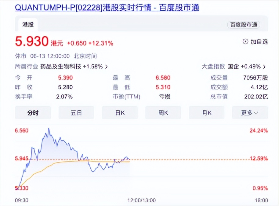 6月13日,晶泰科技在港交所挂牌上市,发行价5.28港元/股,开盘涨2%至5.39港元/股;截至当日午间收盘,每股涨12.31%至5.93港元,总市值202亿。