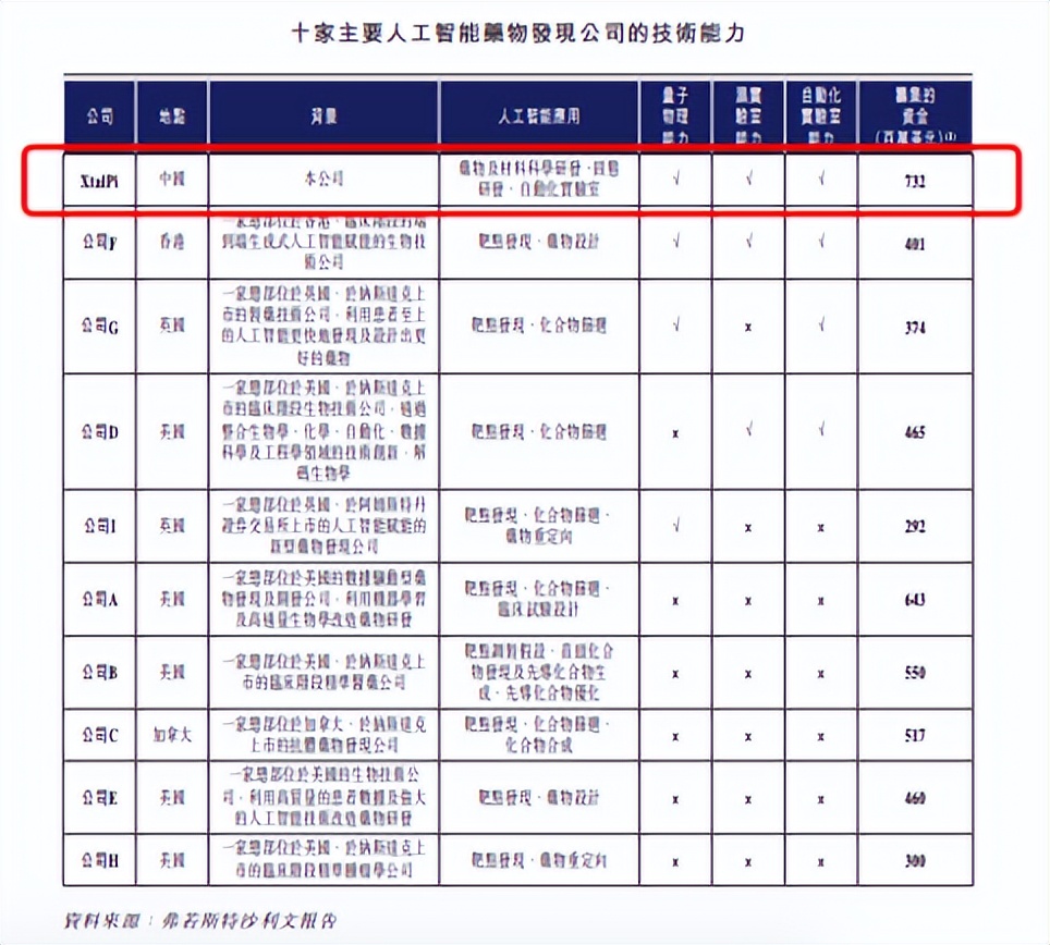 据弗若斯特沙利文的报告,晶泰科技上市前的融资金额为7.32亿美元,位居前列;此外,公司的技术能力比较全面,具有量子物理能力、湿实验室能力、自动化实验室能力,可对不公司F也同样具备这些能力。