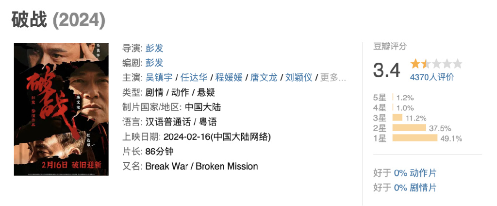 而引进内地的影片,依旧是老一套的警匪片,古天乐、刘青云、吴镇宇几个老演员排列组合,内地观众早已审美疲劳。 今年初的一部《破战》,更是把港片质量拉到新低,豆瓣3.4分,被网友称为“香港电影的至暗时刻”。