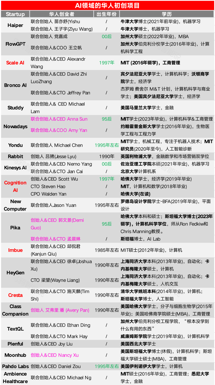 ▲AI领域华人创业者总览,红色标记为独角兽企业,粉色标记为女性创业,绿色标记为95后创业(来源:乌鸦智能说)