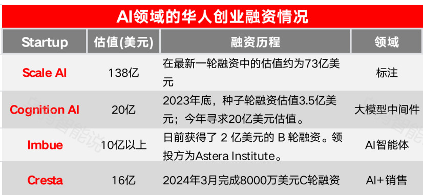 华人创业AI估值总额高达191.4亿美元(约合1388亿人民币),已经跑出了Scale AI、Cognition AI、Imbue、Cresta这4家独角兽。成立于2016年的Scale AI估值已达到138亿美元,其他较年轻的独角兽公司估值都在10~20亿美元之间。