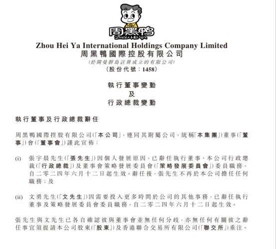 6月12日晚间,周黑鸭(1458.HK)发布一系列人事变动公告,张宇晨辞任执行董事、公司行政总裁及董事会策略发展委员会委员职务,该职位由创始人、周黑鸭董事会主席周富裕兼任。