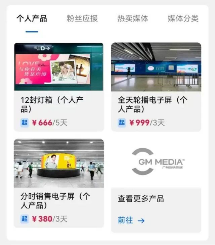 广告价格上,广州地铁传媒官方小程序显示,个人产品价格为380元至999元,投放时间包括3天和5天,投放对象包括分时销售电子屏、全天轮播电子屏和12封灯箱。