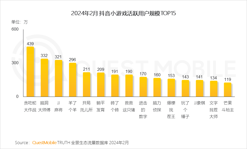 以抖音小游戏为主的小游戏平台,逐渐成为下一个小游戏潜在增长点。从目前情况来看,抖音小游戏凭借抖音平台发挥着内容优势,全面发力小游戏市场。QuestMobile数据显示,今年2月,头部抖音小游戏已经获得百万活跃用户规模,其中《贪食蛇大作战》月活用户规模高达439万,而《脑洞大师傅》《JJ麻将》等小游戏产品的月活用户规模均超过300万。