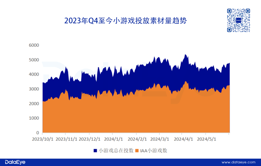 另外,DataEye-ADX数据显示,自23年Q4开始,IAA小游戏投放在投游戏数呈现持续增长,并主导整个小游戏市场在投游戏数情况。今年以来,IAA小游戏参投数量占比大盘的65%。