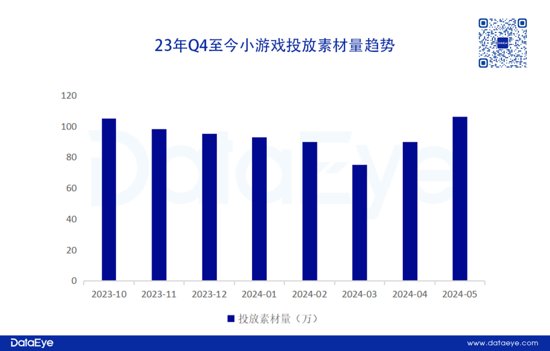 从营销层面来看, 小游戏买量表现稳定。DataEye-ADX数据显示,小游戏买量营销在2023年迎来全面爆发,投放素材量和在投游戏数都呈现稳定高位(偶有月份是淡季),特别在五一、暑假、国庆、春节等重要营销节点的投放增加明显。DataEye-ADX投放数据显示,去年Q4到今年Q1在投游戏数呈现持续增长,投放素材在3月淡季之后也出现触底反弹的迹象。