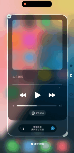 而且,通过拉大、缩小控制选项,你会发现其中的布局与功能会有些许改变,比如媒体控制,最小化时仅支持暂停、上一首、下一首和隔空播放,而在最大化时则新增了收藏、音量控制等选择,并且可以直接控制苹果智能生态中的智能音箱及Apple TV。