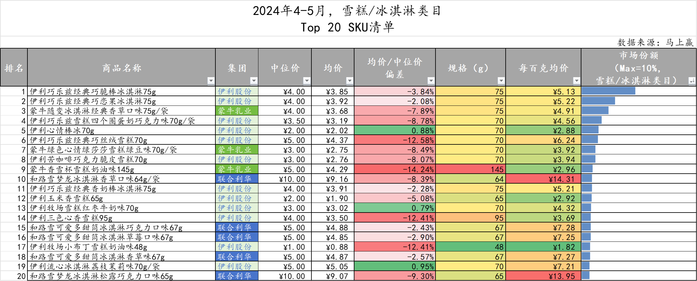 可以看到,TOP20的产品全部由占据大半江山的伊利股份、蒙牛乳业与联合利华这“御三家”包揽。而伊利股份也不愧在CR10集团中位列头名,共有12款产品进入TOP20,并在TOP5中独占四席。来到均价/中位价偏差部分,该数值偏差越大通常意味着促销越多。
