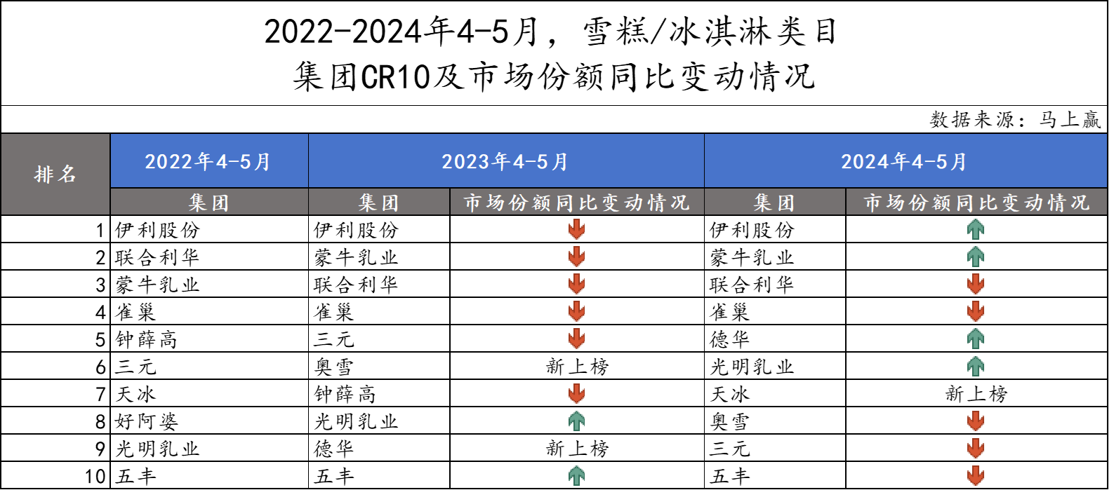 可以看到,在22年-24年三年间4-5月的CR10集团中,22年正值风光无两的钟薛高在当年登榜类目第五名;23年钟薛高跌落至市场份额第七,但依然在榜;而时至24年,钟薛高的名字已经消失在榜单上,难免引人唏嘘。