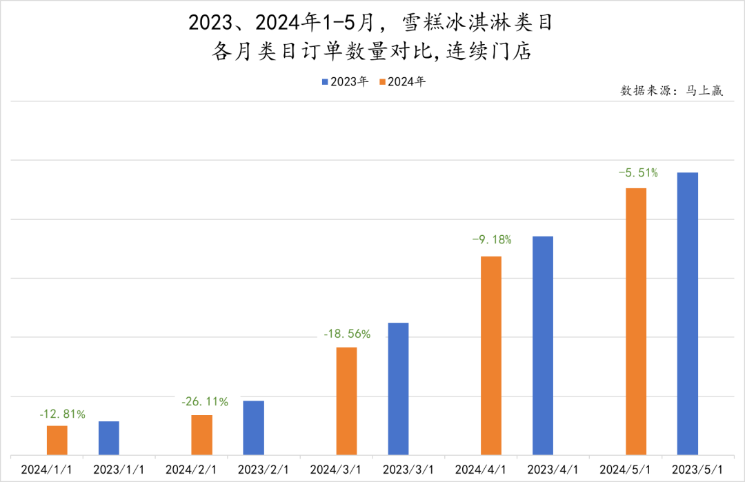 基于马上赢品牌CT中持续追踪超过20个月的连续门店数据,我们拉取了2023年1-5月与2024年1-5月,包含雪糕冰淇淋类目的订单数据的情况。可以看到,虽然2024年/2023年在1-3月同比有较大差距,但在3、4、5三个月,订单量同比的差值正在收窄。2024年雪糕/冰淇淋类目究竟如何,在产品、渠道、价格上又有什么变化?基于马上赢品牌CT中的数据,本周我们数读雪糕/冰淇淋类目。