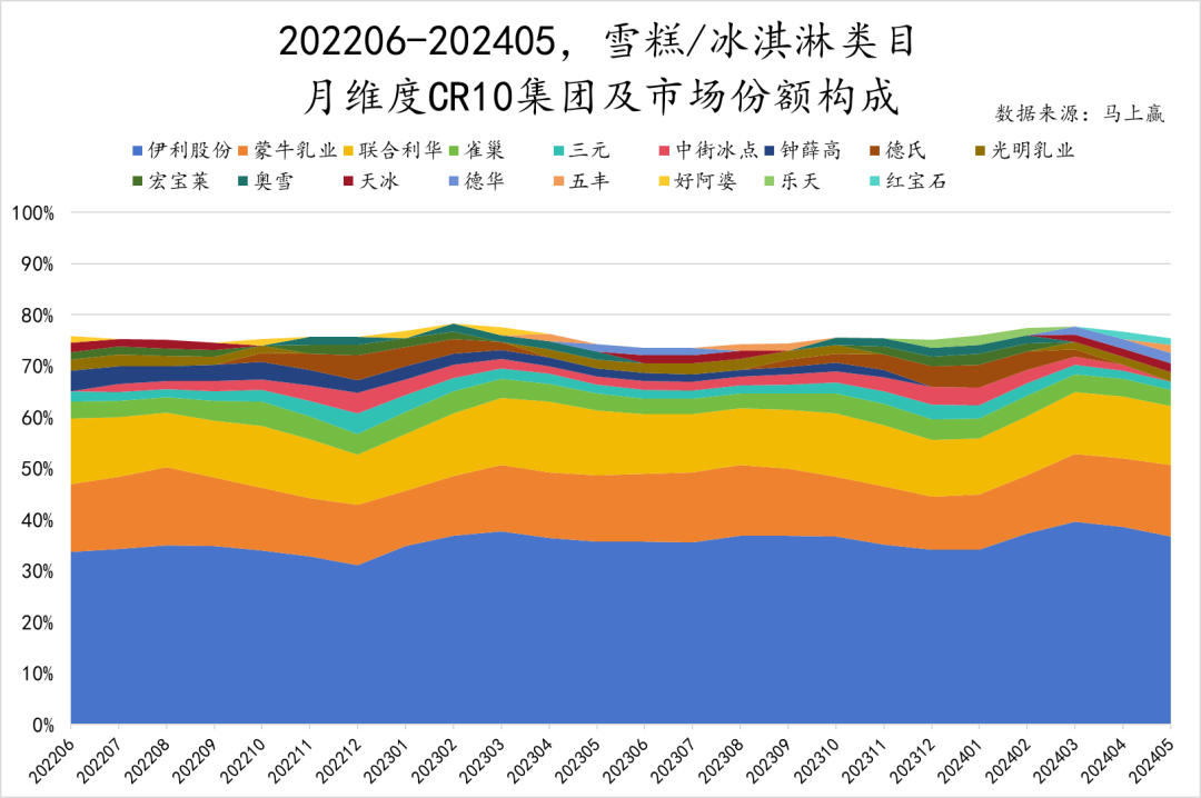 进一步,我们来看从22年6月到24年5月这两年,各大品牌的市场份额变化情况。首先,CR10集团的总份额基本稳定在75%左右,虽然位列CR10集团的企业每年都有所不同,但来去之间CR10总体的份额变化不大,行业集中度长期较高。伊利股份、蒙牛乳业与联合利华三家集团占据了大半江山,其余品牌之间差距不大,谁能抢占更多市场犹未可知——但可以肯定的是,品牌间的激烈竞争会给消费者带来更多选择。