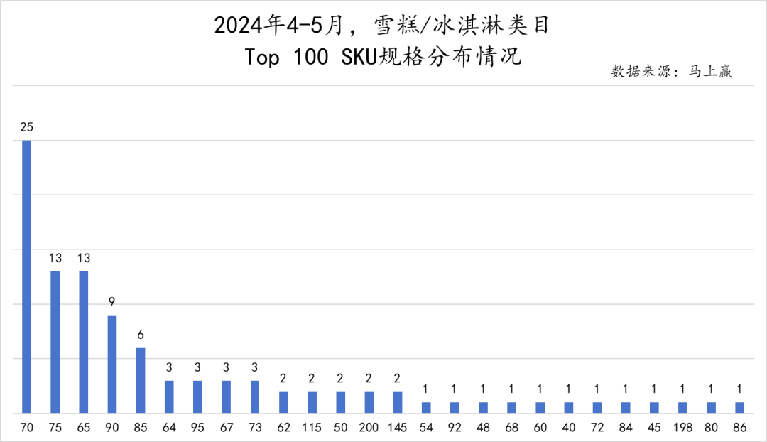 在TOP100 SKU的规格分布中,可以看到70g的中等规格仍占大多数,但也有90g及以上的较重规格产品出现。一般我们会认为,雪糕冰淇淋的常见场景是在炎炎夏日的户外,想解暑了就来一支。但TOP100 SKU规格分布告诉我们,大规格多支装的雪糕家庭装同样受到欢迎。