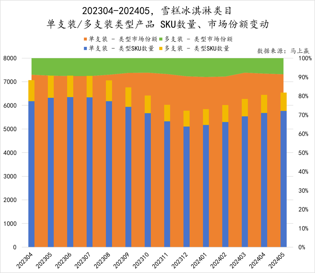 拉长时间段到2023年4月-2024年5月,观察两类产品的SKU数量与市场份额变化的情况,从SKU数量上看,整体上单支装与多支装市场份额变化与类型SKU数量占比变化不大。在作为主流的单支装雪糕冰淇淋之下,多支装逐渐找到了自己在市场中的位置,开始稳中求进。这也向我们解锁了雪糕冰淇淋的另一个应用场景:家庭分享。单支装的雪糕或许适合独自在室外解暑,但多支装雪糕则凭借性价比和便利获得了家庭场景消费者的青睐。