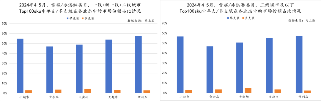 在单支装/多支装类型产品的消费习惯上,城市等级与业态是否会对消费习惯有所影响?回到今年4-5月的TOP100 SKU,我们将城市等级分为一线+新一线+二线、三线城市及以下两部分去观察各业态下单支装/多支装类型产品的市场份额占比情况。