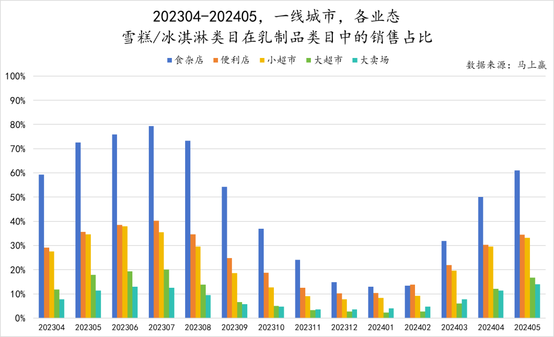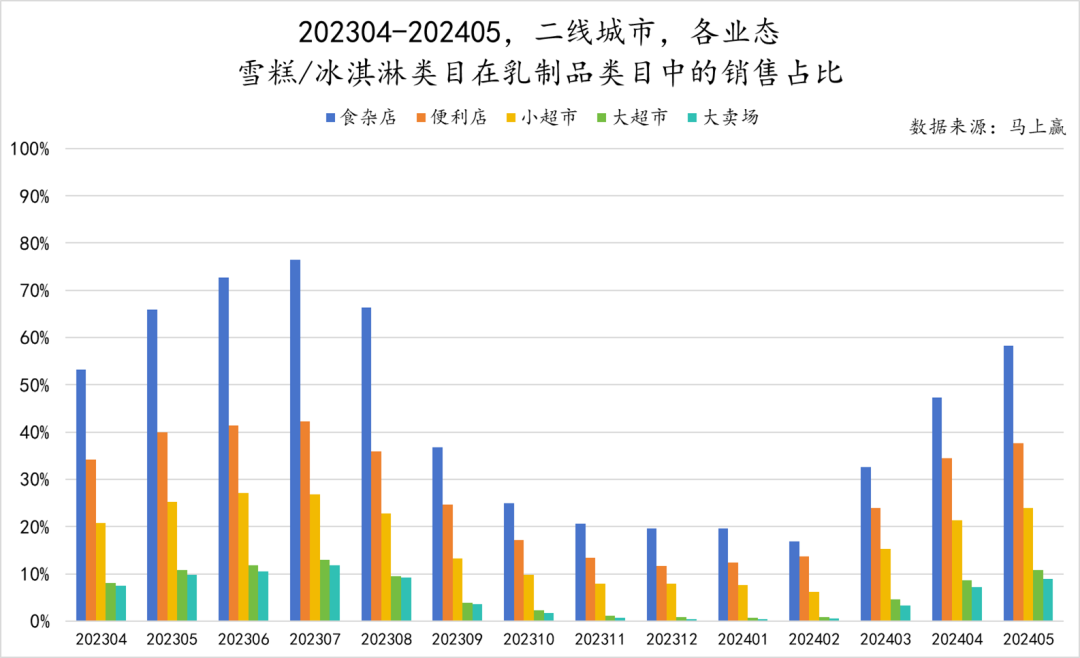 为观察该类目的渠道情况,基于马上赢品牌CT中的数据,我们通过对202304-202405这一时间段内,一线城市、新一线城市、二线城市以及三线城市及以下各城市等级中雪糕冰淇淋类目在乳制品类目中的销售占比,来观察雪糕/冰淇淋这一类目的城市等级、渠道偏好情况。