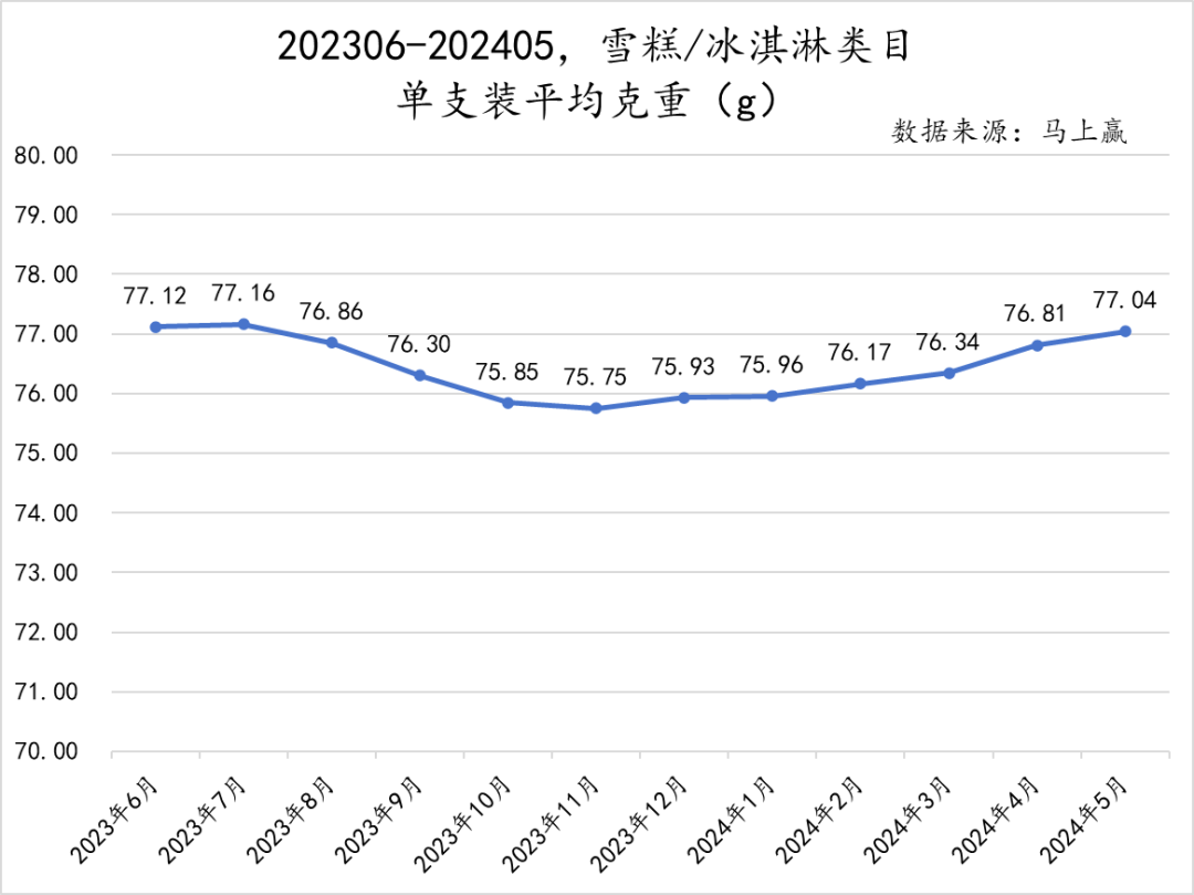 可以看到,从2023年6月到2024年5月,雪糕冰淇淋类目的单支装平均克重集中在75g至77g这一水平。从23年夏季到进入当年冬季,单支装平均克重有轻微下降趋势,但在24年春夏又开始回升。虽然冬季单支装平均克重稍微低于夏季,但整体上来说较为平稳。