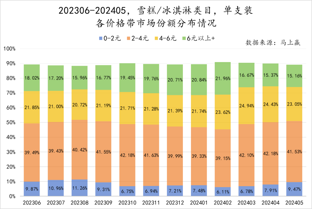 在单支装产品数量上,可以看到0-2元价格带与2-4元价格带基本都占到了3000+的SKU数量,远超过4-6元价格带与6元以上价格带。因为定价相对较低,所以仅看市场份额难以感受到单支装平价雪糕的数量优势。低单价的单支装雪糕适用于这一类目传统的室外即食场景,虽然这一场景目前存在变化的可能性,但影响力依然存在。