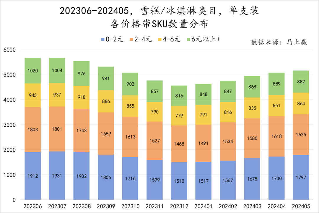 来到各价格带市场份额,就会发现2-4元价格带在市场中占据了优势。从23年6月到24年5月,近一年的实践中,2-4元这一价格带市场份额都保持在40%上下,其次为4-6元价格带、6元以上价格带。0-2元价格带在市场份额方面占比最低,但这与其本身的低定价有关,所以还需要观察该价格带SKU数量情况。需要说明的是,由于部分产品定价未抓取等原因,所以这一分布情况仅包含约90%左右市场份额对应的SKU。