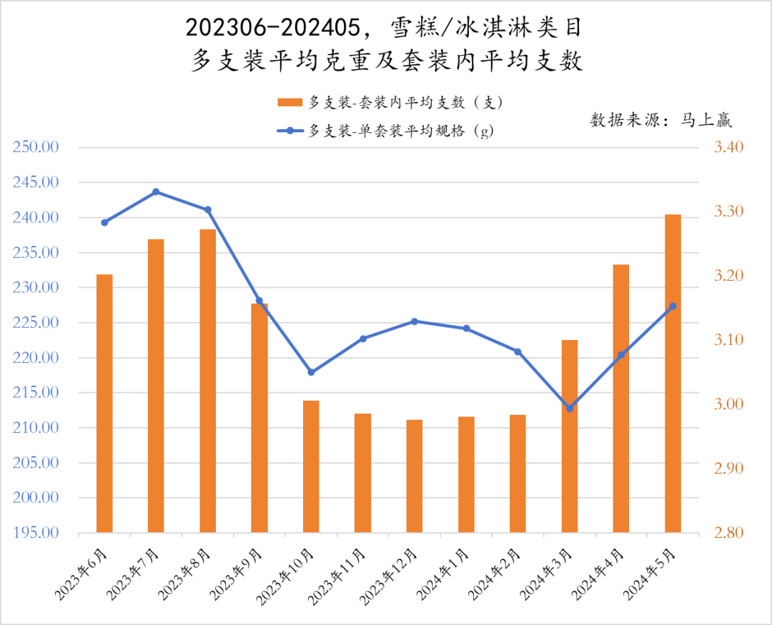 多支装包装的平均支数较23年夏季有所上升,但整体套装的规格却没有上升。这说明了家内组合装雪糕的小型化,从消暑需求多元为零食需求。相比“量大爽吃”,在家庭场景中更受青睐的是多支装产品中单个雪糕的“小巧玲珑”。作为零食,充饥可以是需求但不是必须;而作为零食定位的雪糕同理,消暑可以是需求但不是必须。