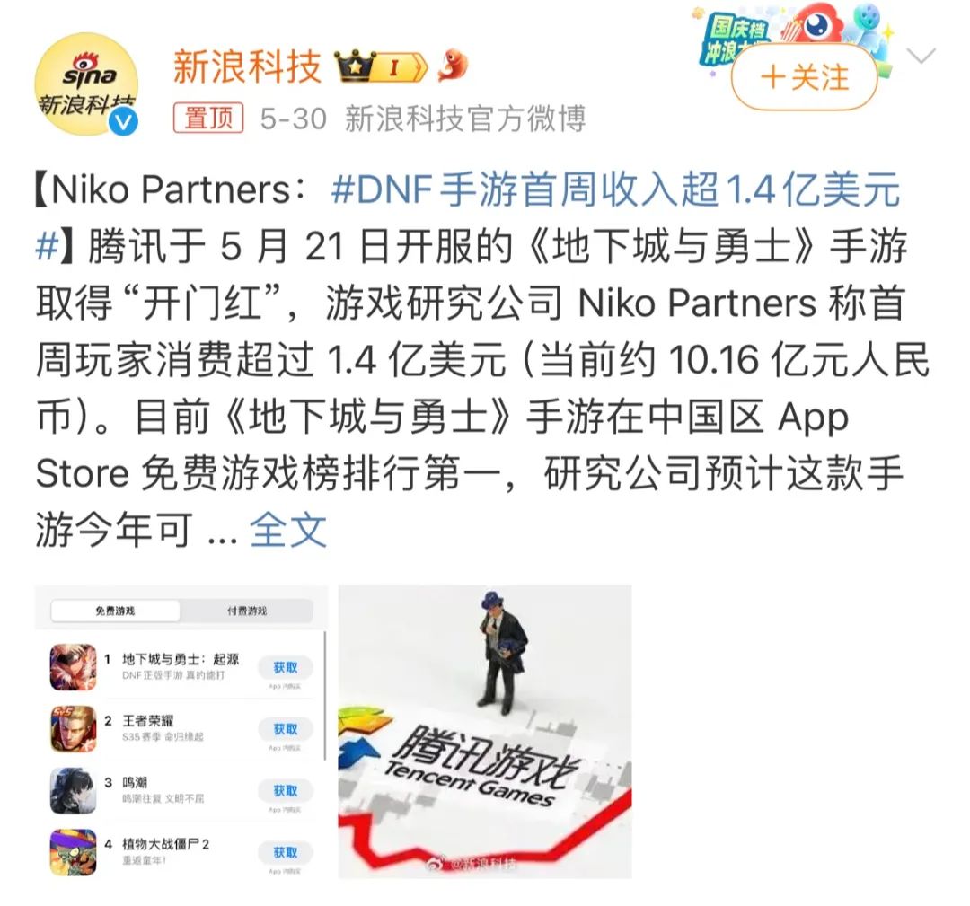 DNF手游首周收入超1.4亿美元(图源:微博)