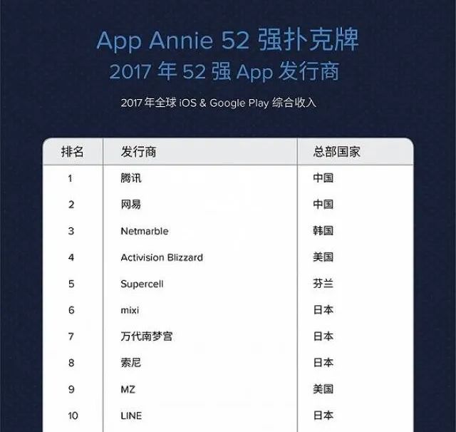 此后,《王者荣耀》一直稳居收入榜首。根据App Annie发布的2017年苹果App Store与Google Play商店收入最高的52家发行商,第一名为腾讯(180亿),第二名为网易(105亿)。而在后来有了《和平精英》加持之后,腾讯坐稳了MOBA和FPS两条赛道,成功拉开了半个身位。