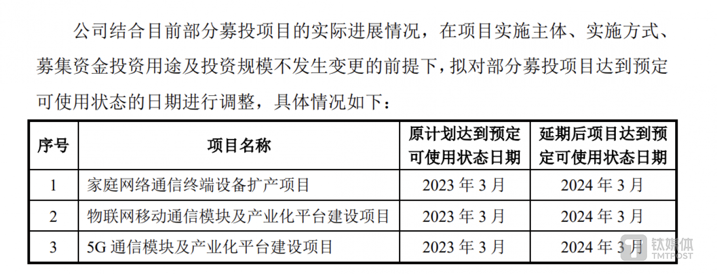 2023年3月,公司对项目一、项目二及项目三达到预定可使用状态的日期进行延期,由2023年3月延期至2024年3月。