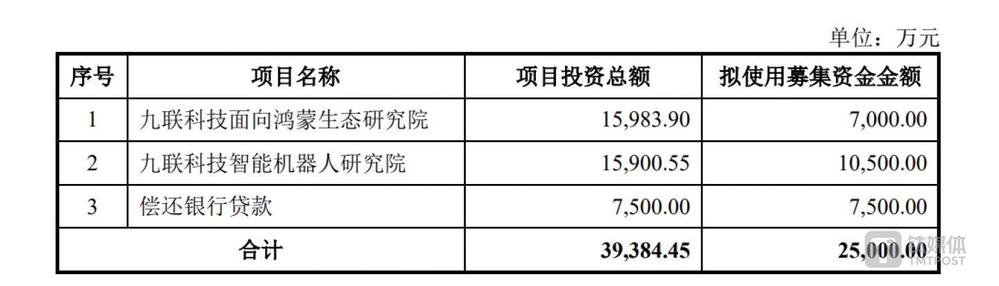 九联科技此次定增要追溯至今年3月15日,据公司披露的《2023年度以简易程序向特定对象发行股票的预案(二次修订稿)》显示,公司拟募集资金总额为2.5亿元,用于投向九联科技面向鸿蒙生态研究院、九联科技智能机器人研究院、偿还银行贷款三个项目。