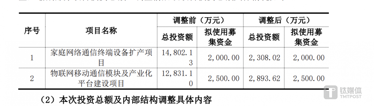 据悉,九联科技上市时共募集资金3.99亿元,用于投向家庭网络通信终端设备扩产项目(下称项目一)、物联网移动通信模块及产业化平台建设项目(下称项目二)、5G通信模块及产业化平台建设项目(下称项目三)、九联科技研发中心升级改造建设项目(下称项目四)、补充流动资金。