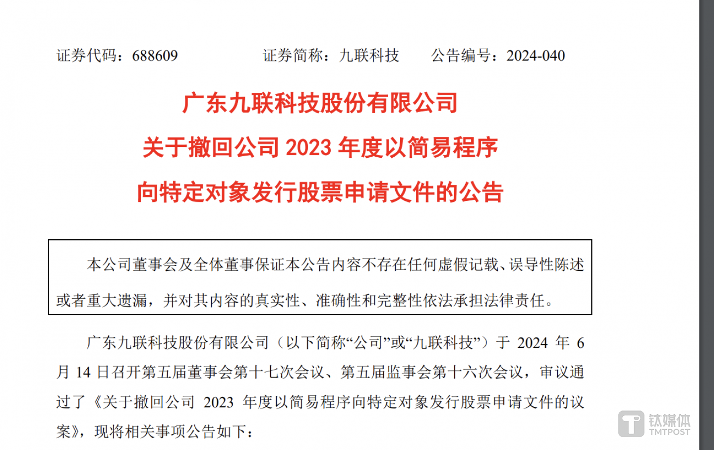 日前,九联科技(688609.SH)发布公告称,基于国内宏观经济及资本市场环境变化,公司决定向上交所申请撤回2023年度以简易程序向特定对象发行股票的申请文件,并将根据市场情况适时重新申报。