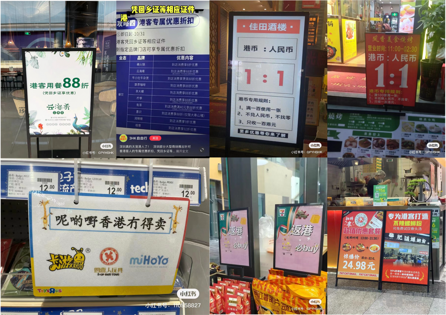据了解,深圳部分大型商场推出针对香港客人的专属优惠折扣,凭回乡证等相应证件,港人便可在指定的品牌门店消费结算时享受优惠折扣。还有一些餐饮店怕港人兑换人民币麻烦,直接接受港币结算,以1:1换算人民币,相当于获得九折优惠。甚至为了匹配港人的饮食喜好,特意为港人量身定做套餐,也成为吸引港人的亮点。有的商超便利店甚至为自己的商品贴上了“返港必buy的标签“,指引港人挑选心仪的产品、快捷结账。还有一些贴心的商场设深港直通大巴,为到深圳购物的港人提供保姆级的往返服务。