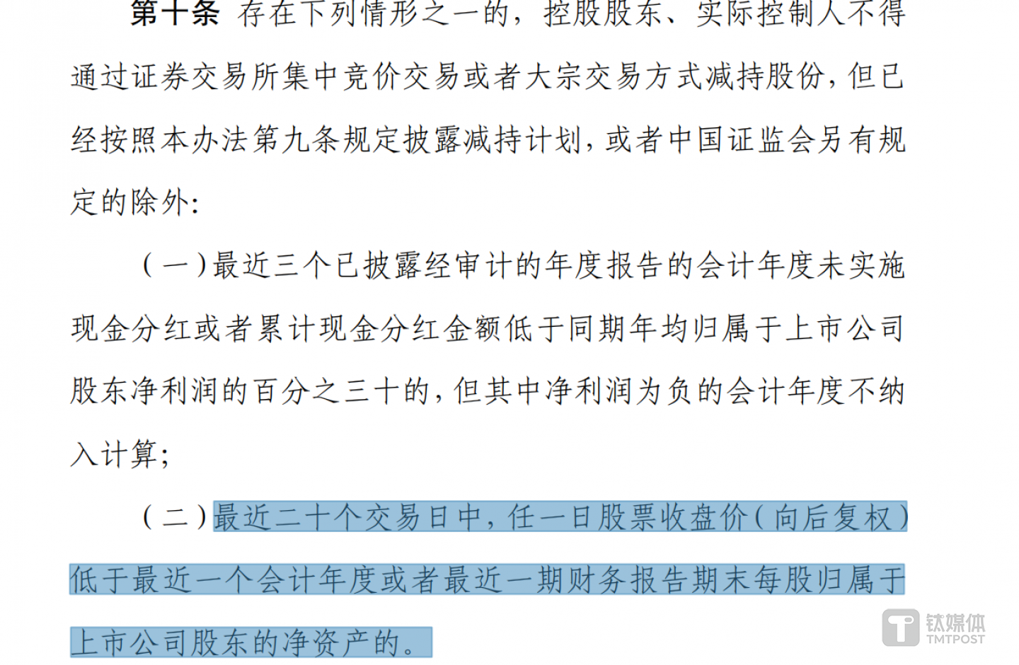减持新规明确规定,最近二十个交易日中,任一日股票收盘价(向后复权)低于最近一个会计年度或者最近一期财务报告期末每股归属于上市公司股东的净资产的,上市公司控股股东、实际控制人不得通过证券交易所集中竞价交易或者大宗交易方式减持股份。