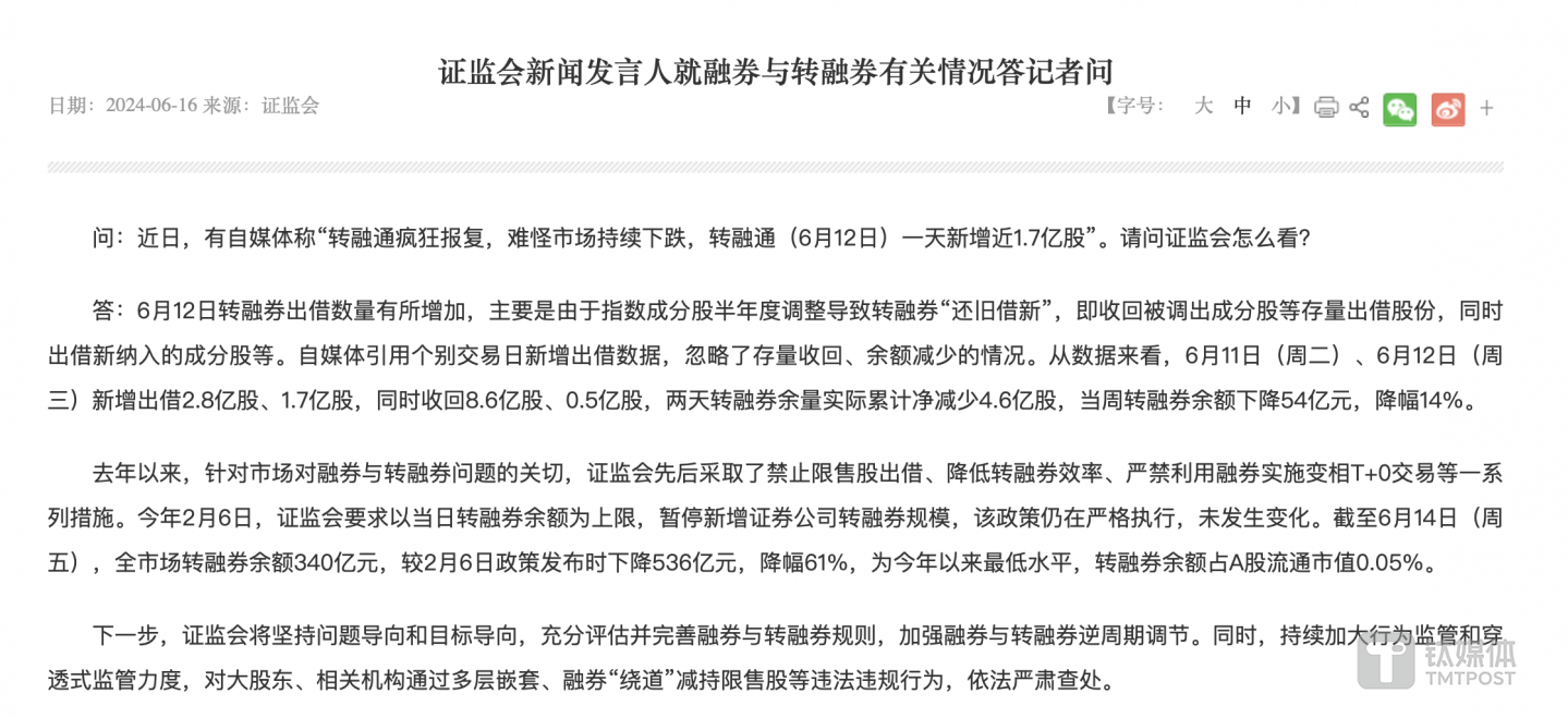 对此,证监会于6月16日回应称,“去年以来,针对市场关切,证监会先后采取了禁止限售股出借、降低转融券效率、严禁利用融券实施变相T+0交易等一系列措施。”