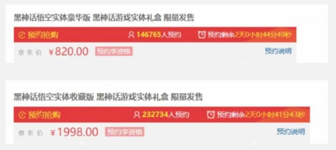 在数字版之外,实体豪华版售价820元,包括了游戏兑换码、收藏铁盒以及黄铜紧箍等游戏周边,实体收藏版则售价1998元,在实体豪华版的基础上额外包含了“天命人”手办和其他周边产品。据分析机构数据显示,《黑神话:悟空》预购三天销售额就已破亿。很少有一款游戏像《黑神话:悟空》这样“事先张扬”。自从2020年8月20日,开发商游戏科学在发布了《黑神话:悟空》的首部演示视频后,掀起的热潮不仅在游戏核心玩家中经久不息,还成功破圈,甚至达到了街头巷尾咸与闻知的程度。