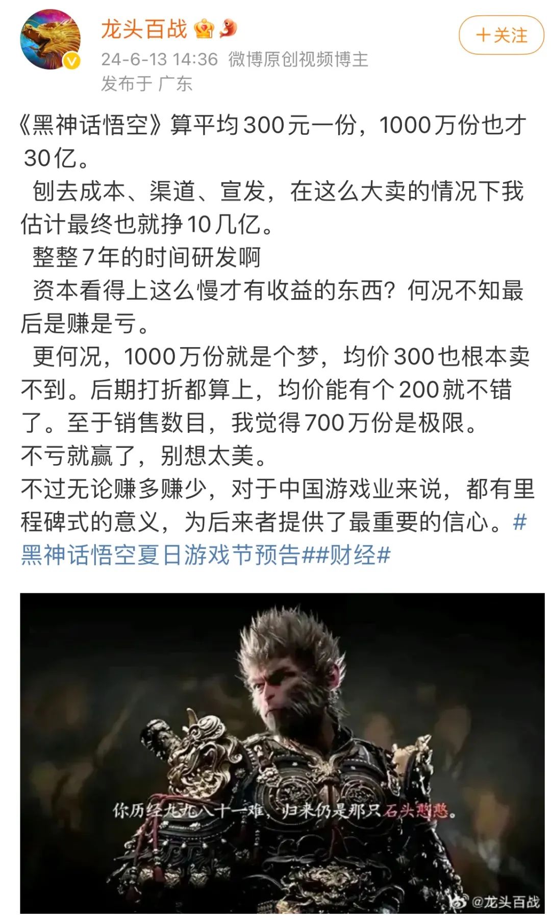 首先是研发周期和成本,根据游戏科学创始人冯骥在接受采访时透露,玩家每小时体验的开发成本约为1500至2000万元人民币。该团队预估整体游戏时长将达到 15 个小时以上,而实际研发时长是这个时间的 1.5 倍以上。若以此为基准,《黑神话:悟空》的研发成本起码要4亿元。