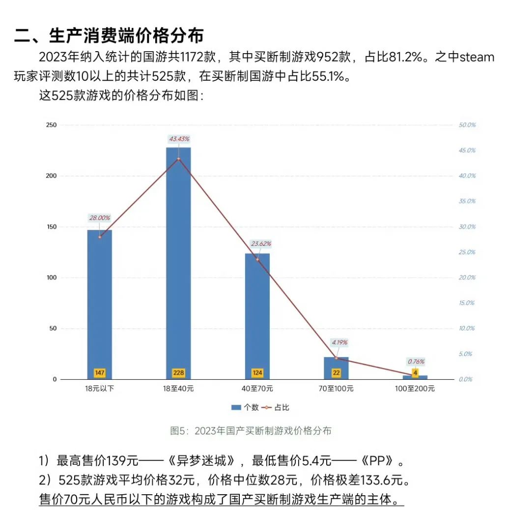 根据国游销量吧的统计,2023年 525 款国产游戏的平均价格为 32 元,价格中位数为 28 元。近些年国产游戏一般都定在 70 元以下,像《古剑奇谭 3》这样好评居多的买断制单机游戏,也只卖到了 99 元,100元像是一座难以逾越的高山。