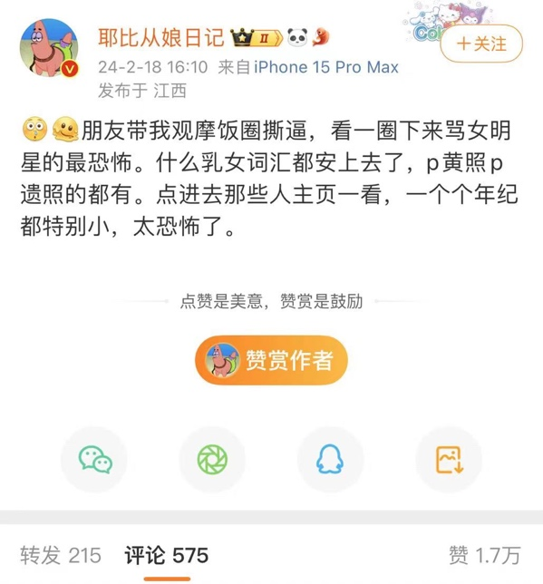 博主@耶比从娘日记 曾发文,称朋友带自己观摩饭圈撕逼,其中对女明星的辱骂十分恐怖,“什么乳女词汇都安上去了,p黄照p遗照的都有”。截至目前,该条博文点赞破万,评论里网友分享了各种辱骂女明星的过激案例。