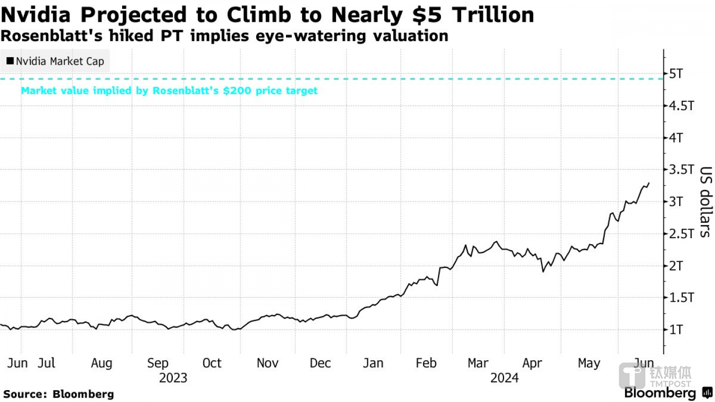 罗森布拉特证券公司分析师汉斯·莫斯曼 (Hans Mosesmann)周二甚至将英伟达的目标价从 140 美元上调至华尔街最高价 200 美元,从而在未来一年将其市值推高至近 5 万亿美元。摩西曼强调:“我们预计,就整体销售组合而言,未来十年软件业务将显著增长,并且由于可持续性,英伟达估值将出现上行趋势。”