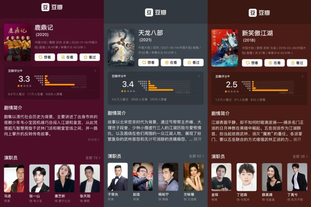 除了2017年李一桐版的《射雕英雄传》口碑尚佳之外,这一阶段的金庸改编剧基本都是口碑、收视双扑街,甚至还诞生了豆瓣评分仅2.5分的《新笑傲江湖》、3.3分的《鹿鼎记》、3.4分的《天龙八部》,金庸武侠剧沦为了B站烂片解说素材。
