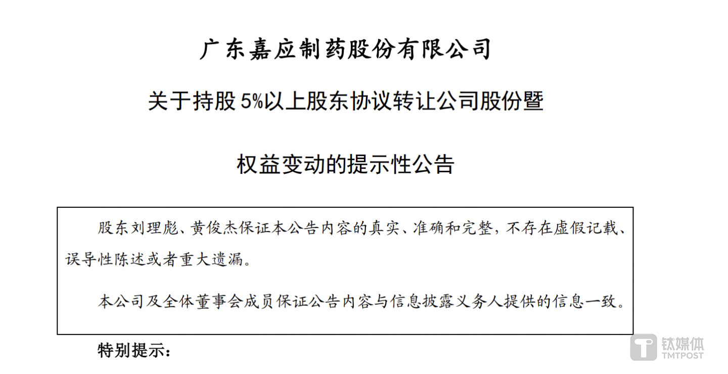 钛媒体APP梳理后发现,刘理彪入局时间为2021年,当年11月,嘉应制药股东黄智勇、黄利兵与刘理彪于签署《股份转让协议》,上述两人合计将其持有的公司2550.51万股(占公司总股本的5.03%)转让给刘理彪。彼时,标的股份的转让价格为8.38元/股,与公司当时股价7.66元相比,溢价9.4%,转让价款合计为2.14亿元。