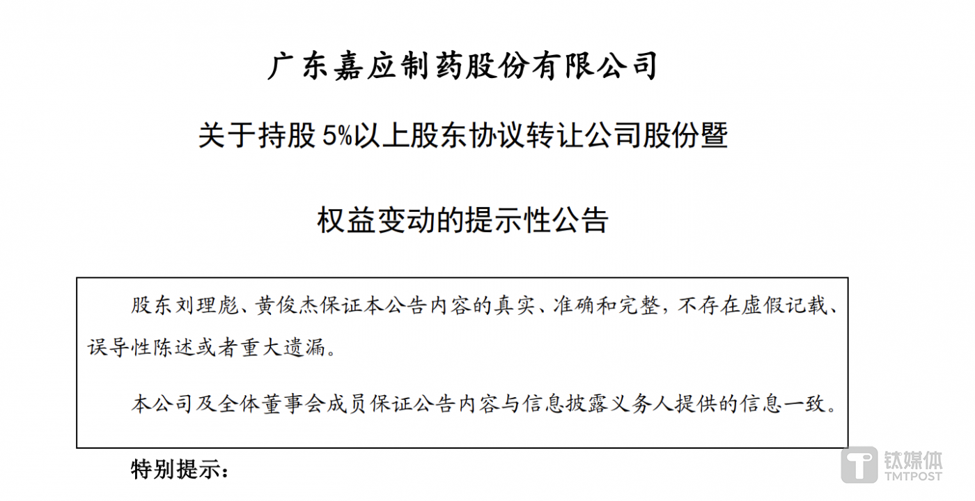 钛媒体APP梳理后发现,刘理彪入局时间为2021年,当年11月,嘉应制药股东黄智勇、黄利兵与刘理彪于签署《股份转让协议》,上述两人合计将其持有的公司2550.51万股(占公司总股本的5.03%)转让给刘理彪。彼时,标的股份的转让价格为8.38元/股,与公司当时股价7.66元相比,溢价9.4%,转让价款合计为2.14亿元。