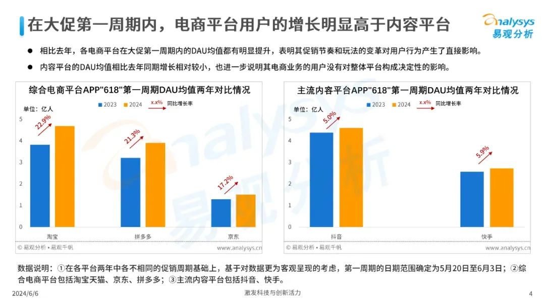 根据易观数据发布的《2024年618第一周期观察》则显示,今年618第一周期,以淘宝、京东、拼多多为主的综合性传统电商平台,在大促期间的用户活跃度和用户DAU增速都优于以抖音为主的内容电商平台。