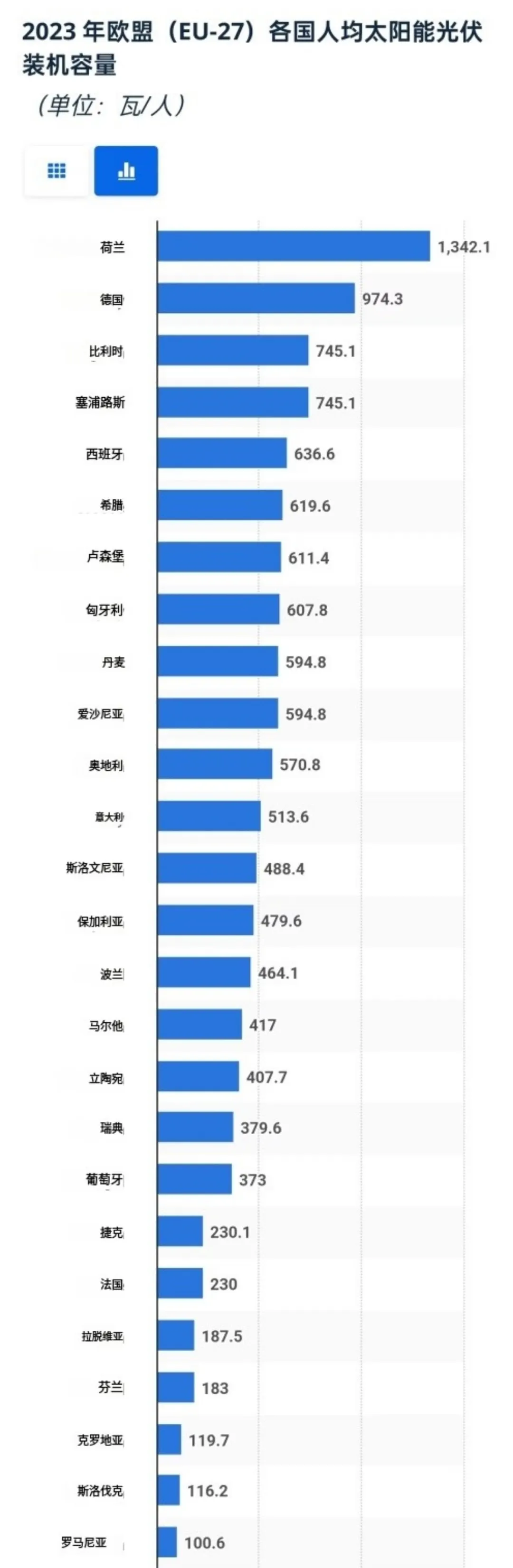 截至2023年末,中国的人均光伏装机容量,排在欧盟27国中的第16位,介于波兰的464.1W与马尔他的417W之间。